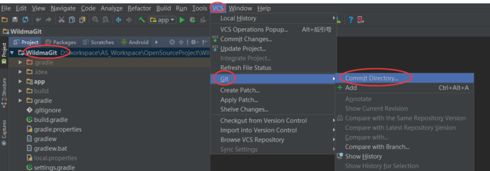 Update后就可以提交文件了,选中项目的根目录,点击Android Studio顶部菜单栏上的VCS-->Git-->Commit Directory...,如图: