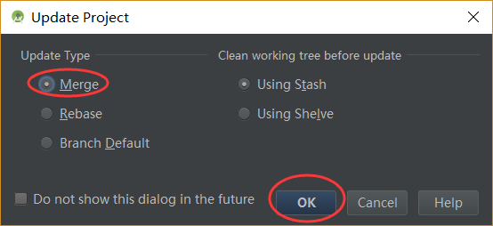 然后选中Merge,点击OK,如果本地代码与远程代码有冲突就会弹出冲突提示,根据需求Merge即可,如图: