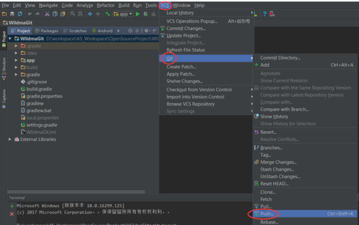 点击Android Studio顶部菜单栏上的VCS-->Git-->Push...,如图: