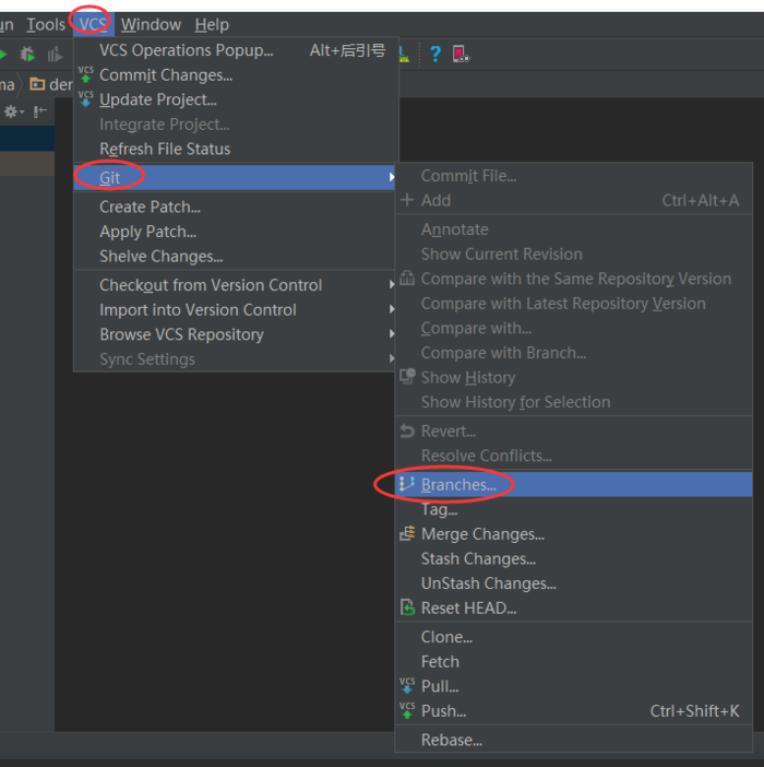 点击Android Studio顶部菜单栏上的VCS-->Git-->Branches...,如图:
