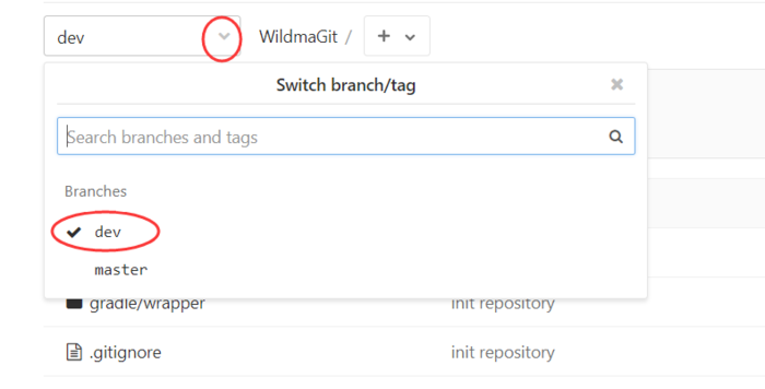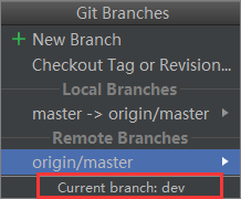 点击OK,分支dev就创建成功了,并且默认切换到该分支。重复上面的步骤可以看到当前分支显示的是dev,如图: