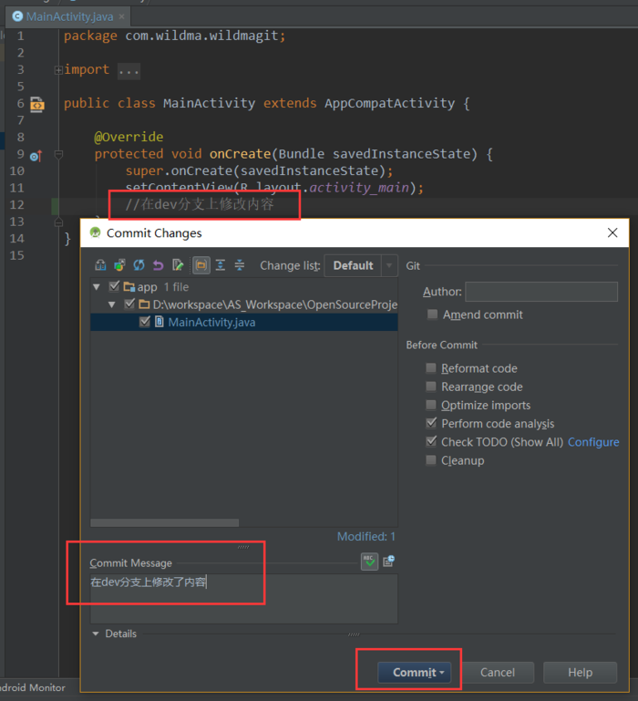 这时候我们在dev分支上修改内容,然后按照前面说的提交文件(步骤5.1.5),将提交的文件推送到远程仓库(步骤5.1.6)即可。如图: