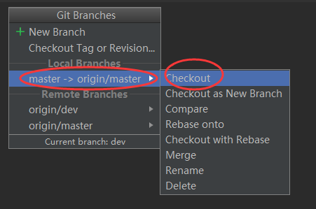 dev分支上版本V1.0开发完了,需要将代码合并到master上进行发布。因为当前在dev分支,所以需要先切换到master分支,点击Android Studio顶部菜单栏上的VCS-->Git-->Branches...,打开Git Branches窗口,然后选择本地分支栏下的master->origin/master,然后点击Checkout。如图:
