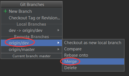第三步已经将分支切换到master了,现在进行分支合并。点击Android Studio顶部菜单栏上的VCS-->Git-->Branches...,打开Git Branches窗口,然后选择远程分支栏下的origin/dev,然后点击Merge。如图:
