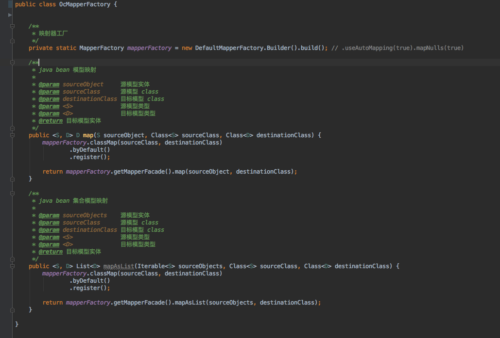 这个OcMapperFactory是用来封装orika的工具类,而orika是一个对象映射工具。由于这里没有用单例导致了内存的泄露。加上单例再看看: