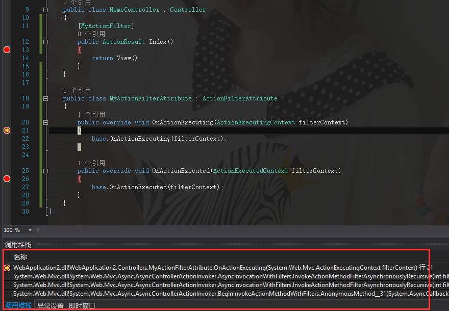 namespace WebApplication2.Controllers{ public class HomeController : Controller { [MyActionFilter] public ActionResult Index() { return View(); } } public class MyActionFilterAttribute : ActionFilterAttribute { public override void OnActionExecuting(ActionExecutingContext filterContext) { base.OnActionExecuting(filterContext); } public override void OnActionExecuted(ActionExecutedContext filterContext) { base.OnActionExecuted(filterContext); } }}