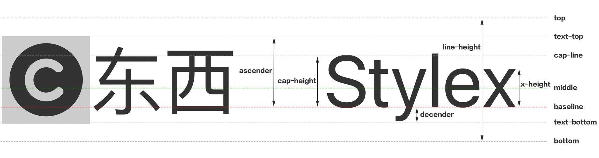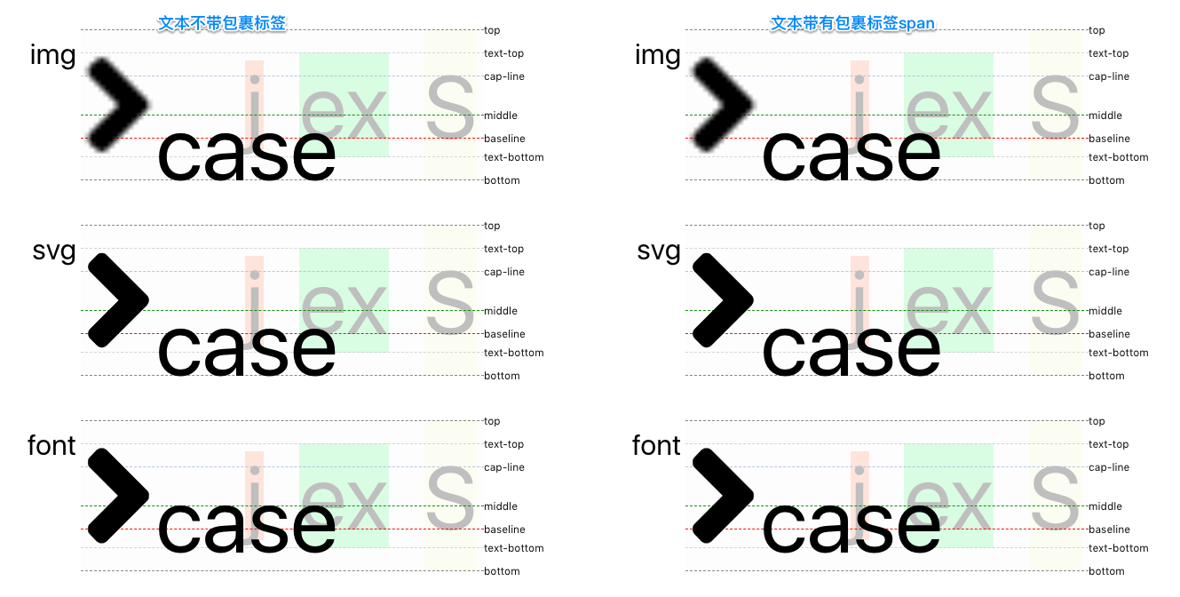cap-line之外都是vertical-align的可选值,每种值得到的不同效果,可以阅读vertical-align,你应该知道的一切一文vertical-align作用于文本和非文本(比如示例中的img、svg等元素)效果将不同,比如vertical-align取值为baseline时:“同一行内不同字体类型、字体大小或不同行高的文本对齐在相同的baseline上;同一行内不同尺寸的图片底边对齐在baseline上”xHeight为小写字母x的height,可以用ex单位来表示(1ex大约等于0.5em),如果vertical-align取值为middle,那么middle的值就是xHeight的一半(xHeight / 2),因此,如果仅对图片应用于vertical-align: middle时,图片看上去会偏下capHeight为大写字母高度(CSS和JavaScript都无法获取),大多数字体约为0.7em