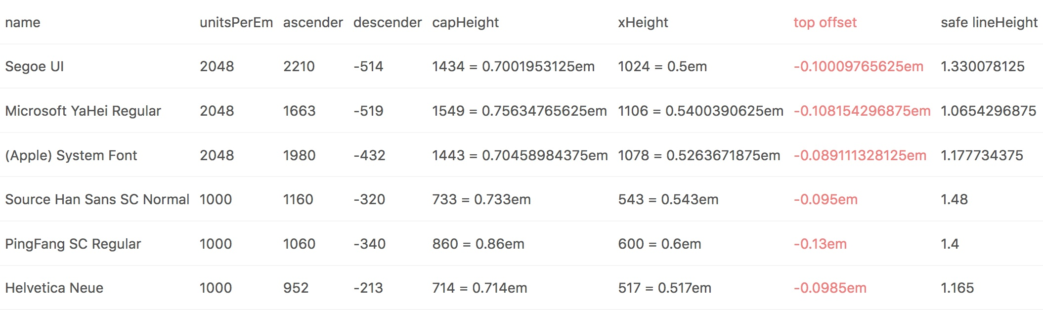 top: calc(.5ex - .35em);}其实这种方式也是我们常用的一种方式,但最终的效果也只能得到近似对齐的效果,因为示例中的偏移值会根据当前字体不同而有细微差异。比如下图所展示的数据,就是根据Font Metrics的参数,针对不同字体计算出来的值: