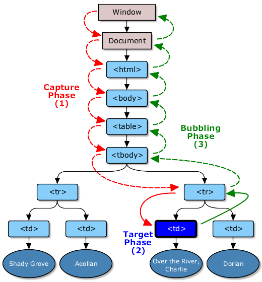 简而言之:事件一开始从文档的根节点流向目标对象(捕获阶段),然后在目标对向上被触发(目标阶段),之后再回溯到文档的根节点(冒泡阶段)。