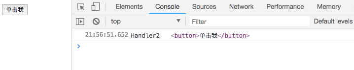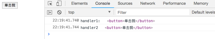 document.querySelector('button'). = handler2当你点击button按钮时,浏览器控制台只会输出hander2()函数做的事情: