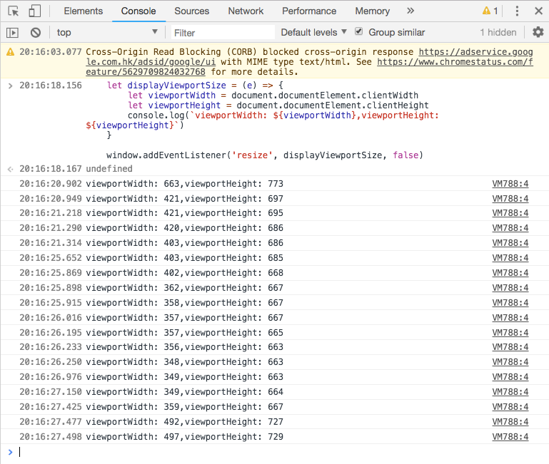 window.addEventListener('resize', displayViewportSize, false)运行上面的代码,随着你改变浏览器窗口大小时,将会输出更改后视窗width和height的值,如下所示:
