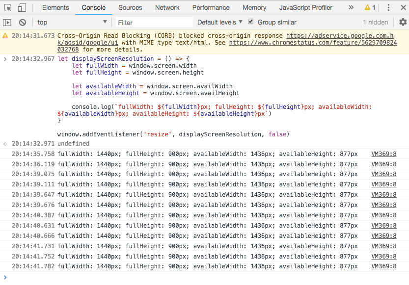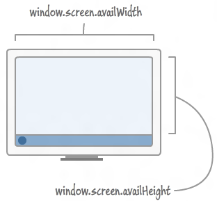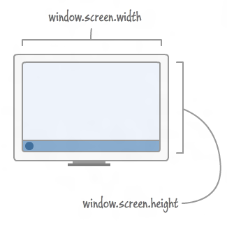 let displayScreenResolution = () => { let fullWidth = window.screen.width let fullHeight = window.screen.height let availableWidth = window.screen.availWidth let availableHeight = window.screen.availHeight