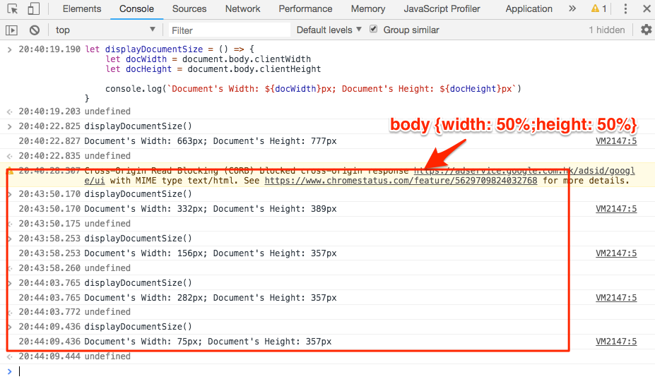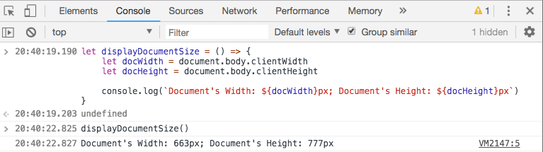 let displayDocumentSize = () => { let docWidth = document.body.clientWidth let docHeight = document.body.clientHeight