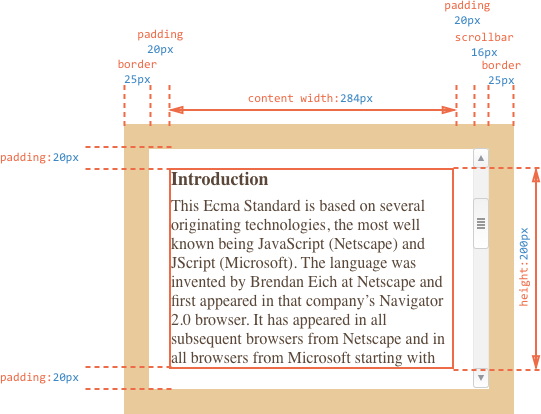 上面的图片展示了元素有滚动条的情形,这也是最复杂的情况。有些浏览器(不是所有)通过从内容中获取空间来为它保留空间。