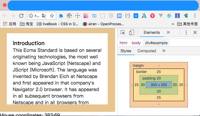 通过浏览器开发者工具可以很轻易的看到元素#example的盒模型视图。视图中清晰的表示了padding、margin和border的值是如何表示的。而且在视图中,可以看到每个CSS属性,以及其对应的值。