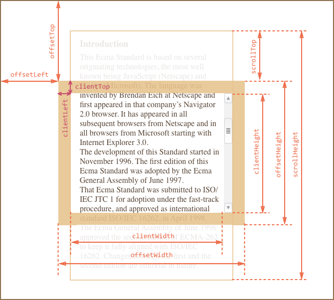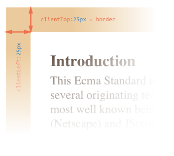 偏移量属性没有考虑的一个值是元素的border。原因是,border被认为是内部元素的左上角的一部分,但是它的大小对某些东西的位置有影响。为了测量border的大小,我们使用clientLeft和clientTop来获取。这两个属性我们后面会介绍。