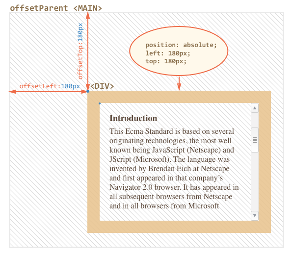 比如下面这个示例,内部的<div>元素具有<main>作为offsetParent,而offsetLeft和offsetTop从左上角移动180px(即向右下角方向移动)。