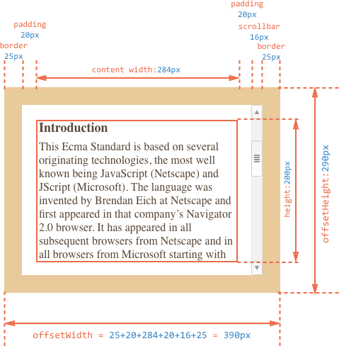 先来看上图是有关于clientHeight的值,因为它更容易。主要是没有水平滚动条,所以它正好是边框内区域的总和:height + padding-top + padding-bottom,即:200 + 2 * 20 = 240px。