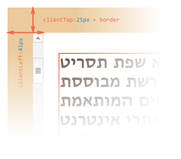 比如这样的一个示例,当文档是从右到左排版(操作系统是阿拉伯语或希伯来语)时,也就是direction为rtl,它就可见了。然后滚动条不在右边,而是在左边,这个时候clientLeft的值也包含了滚动条的宽度。