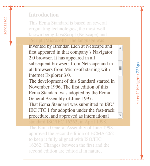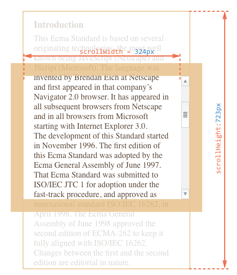 在下面的图片中,我们可以看到在一个块中垂直滚动条的scrollHeight和scrollTop: