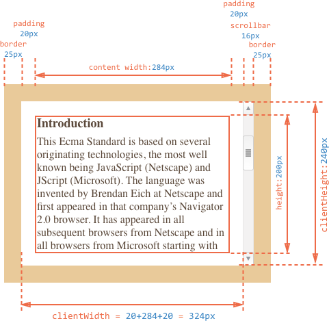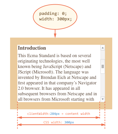 再来看clientWidth。这里的内容宽度不是300px,而是284px,因为还有一个16px宽的滚动条。所以clientWidth的值是284 + 20 * 2 = 324px。