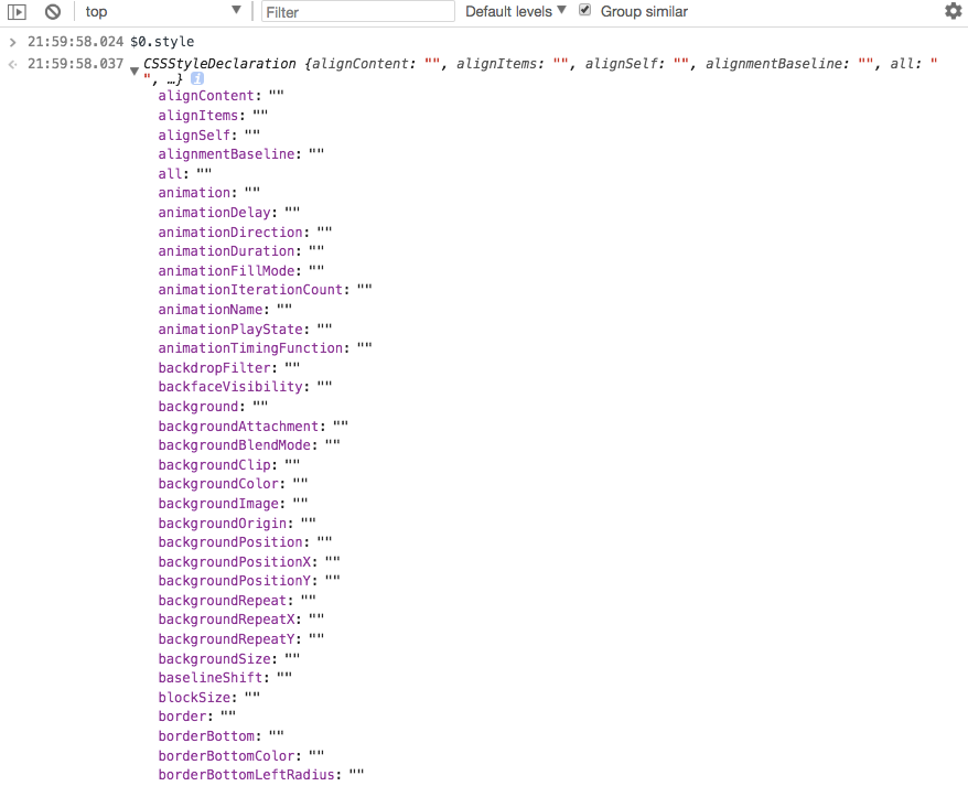 通过JavaScript访问的每个HTML元素都有一个style对象。该对象允许您指定CSS属性并设置其值。比如你在浏览器控制台中输入$0.style就可以看到类似下图这样的一个截图: