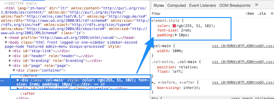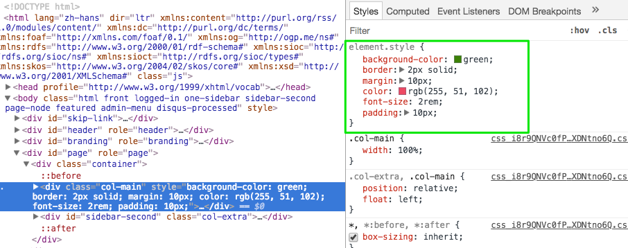color、font-size和padding属性被追加到元素的style上,而不是直接覆盖,比如下图所示: