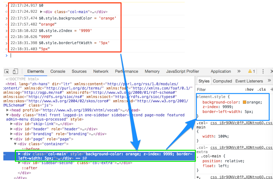 简单地说,要直接使用JavaScript来控制元素样式,第一步是要选中要被修改样式的元素。上面示例使用的是$0这样的快速选择元素方式(在浏览器控制台中可以这么使用),在JavaScript中,可以使用querySelector()方法选中元素,当然在JavaScript中还可以使用其他的方式,比如前面《getElement* 和 querySelector*》一文中介绍选中元素的方法。第二步是找到你关心的CSS属性(想要更换的CSS样式属性,比如上例中的backgroundColor,其实对应的就是CSS中的background-color),然后给该属性赋值。需要注意的是,CSS中的许多值实际上是字符串。也要记住,很多值需要带有像px或em这样的度量单位才能被识别。