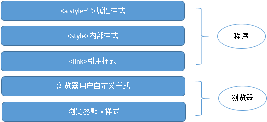 style属性,HTML的style标签样式和link引用样式;其中另外两个是浏览器客户端的样式:浏览器默认样式和浏览器用户自定义样式。用一张图简单的描述就如下图所示: