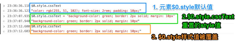 cssText时要给一个元素删除style中的样式,可以给该方法设置值为空字符串,比如:$0.style.cssText = '';