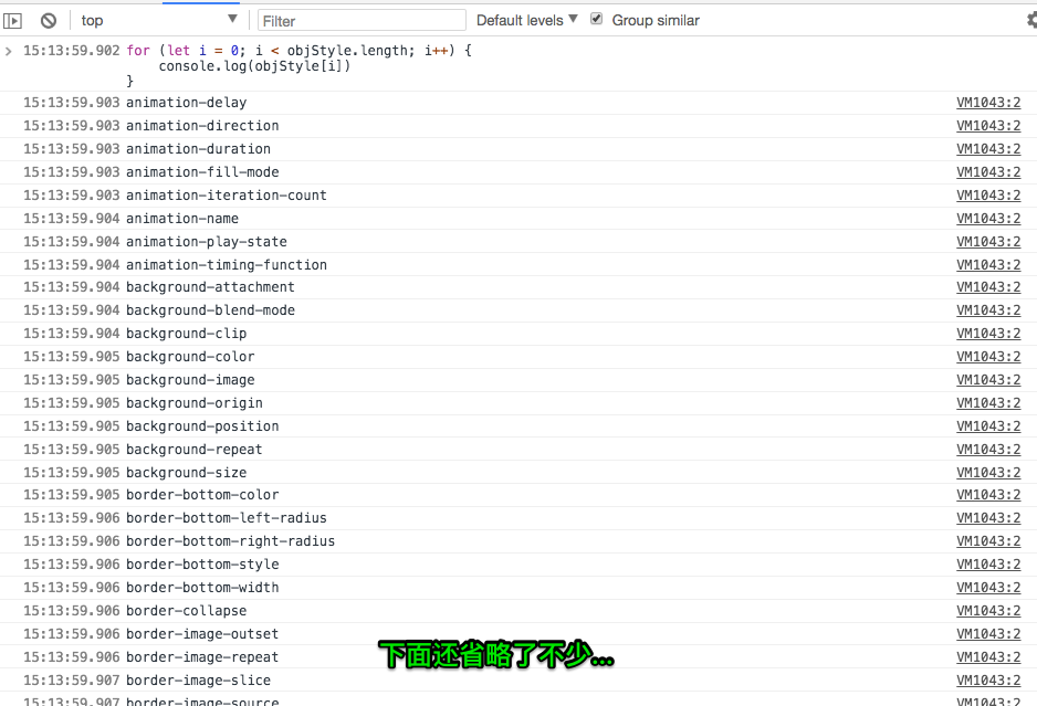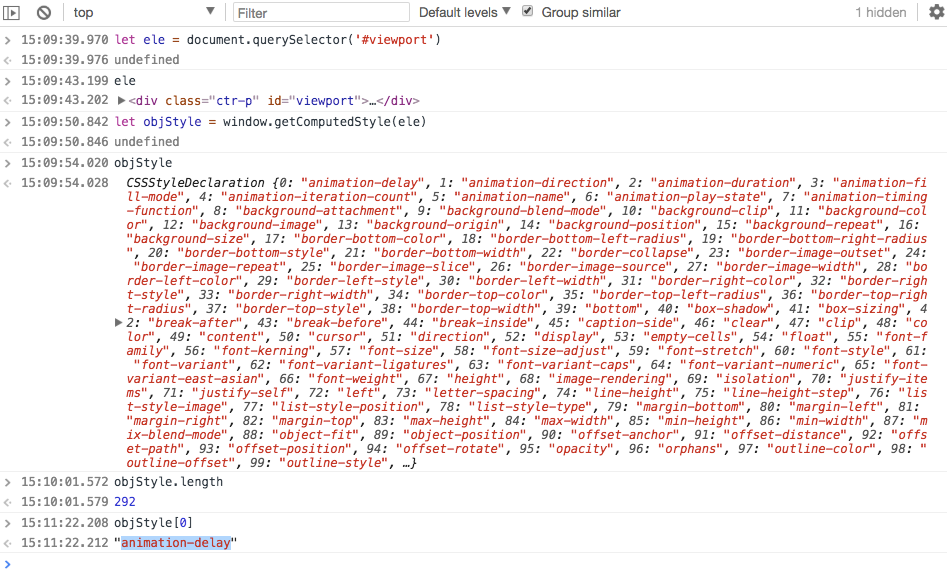 CSSStyleDeclaration实例返回的是一个object,那么我们object的一些属性和方法也可以用到这里。比如length、item()之类的等。比如:let ele = document.querySelector('#viewport')let objStyle = window.getComputedStyle(ele) objStyle.length // => 292objStyle[0] // => animation-delay