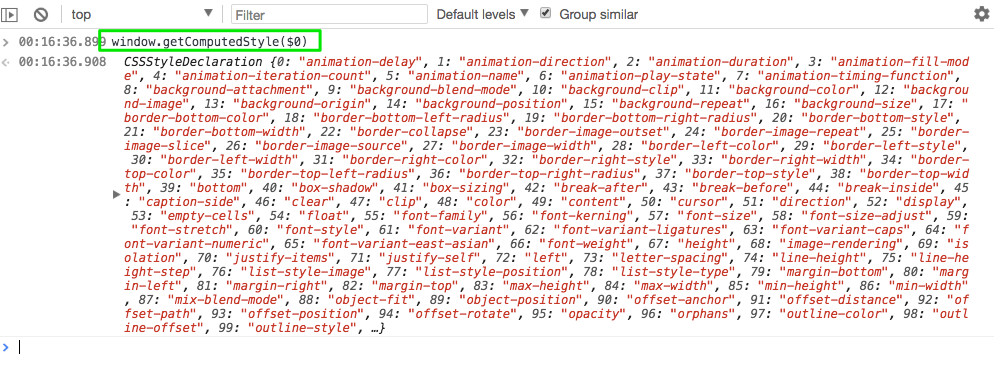 $0计算出来的最终样式信息。如果我们把其赋值给一个变量,比如objStyle,那么我们可以通过类似下面的方式取出元素对应的样式属性的值:objStyle.color // => rgb(64, 64, 64)objStyle.backgroundColor // => rgba(0, 0, 0, 0)