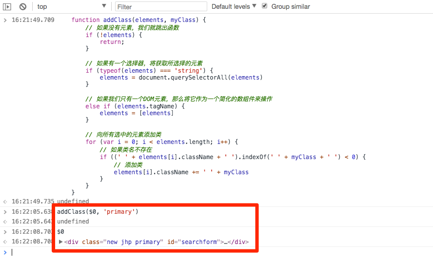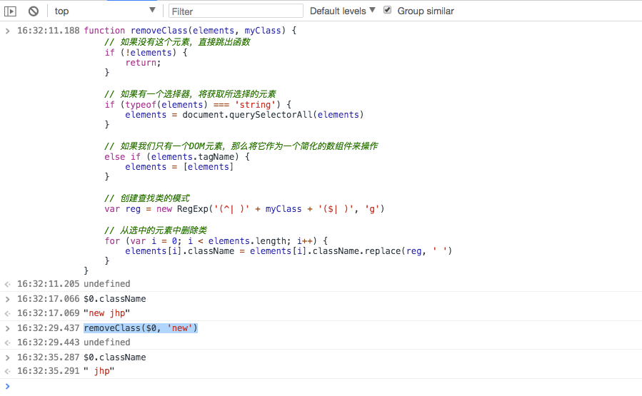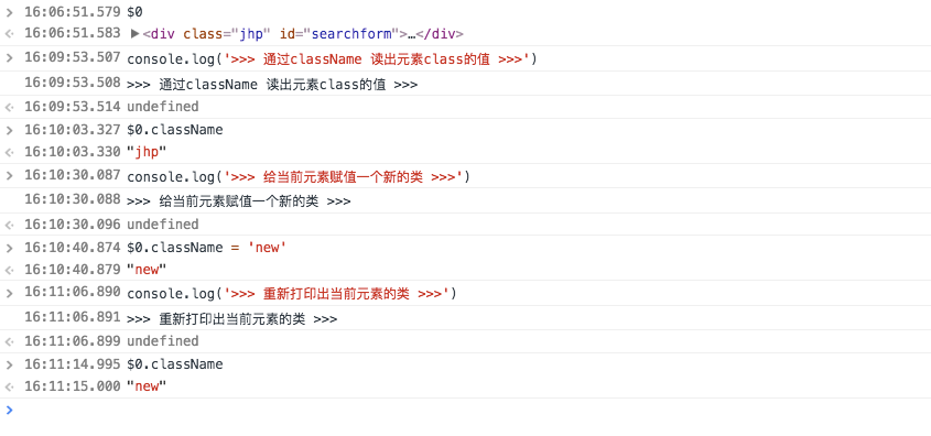 className给指定的元素删除一个类名,相对来说比较麻烦一点。比如上例,咱们使用addClass()函数之后,通过$0.className可以读取出当前元素$0的class的值为new jhp primary。如果我们要把类名重新恢复到new jhp时,只能像下面这样:$0.className = 'new jhp'