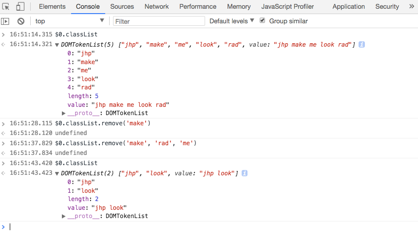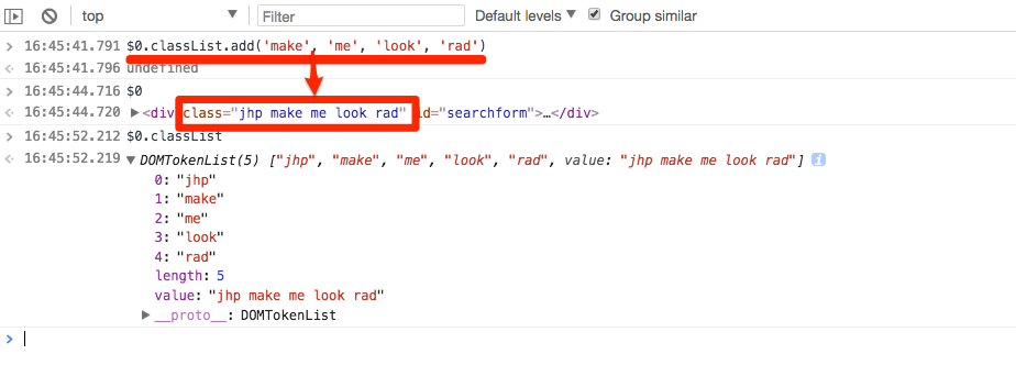 classList.add()添加类名,咱们可以像下面这样:$0.classList.add('make', 'me', 'look', 'rad')