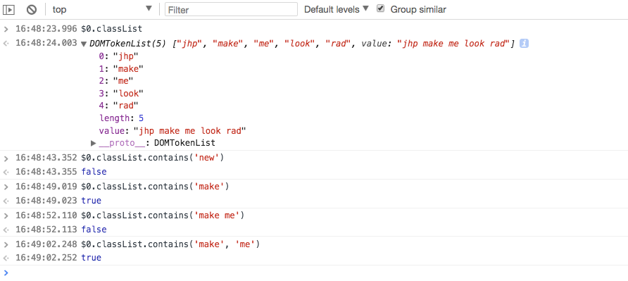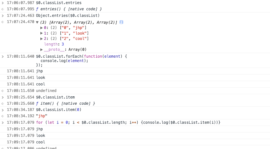 $0,可以在浏览器中输出$0.classList对应的值。从返回的结果上可以看出来,其返回的是DOMTokenList。而且从其__proto__中可以找到classList对应的API,比如add、contains、remove等。