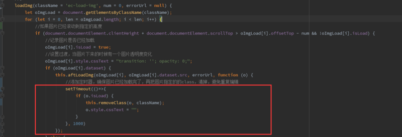 if (oImgLoad[i].dataset) { this.aftLoadImg(oImgLoad[i], oImgLoad[i].dataset.src, _errorUrl, function (o) { //添加定时器,确保图片已经加载完了,再把图片指定的的class,清掉,避免重复编辑