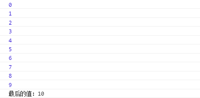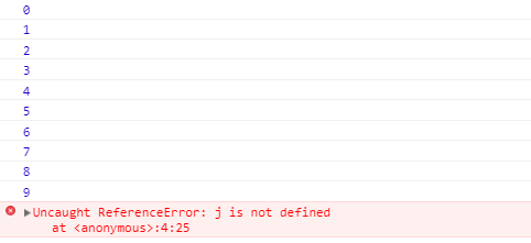 }console.log('最后的值:'+i)//j只在这个for循环有效,如果在循环外调用就会报错for(let j=0;j<10;j++){ console.log(j)