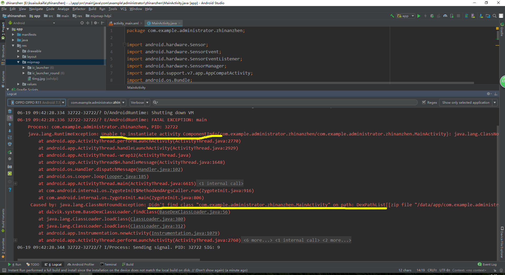 今天做了一个关于传感器的demo,任何地方都没有出错,但是运行安装到真机的apk居然老是闪退