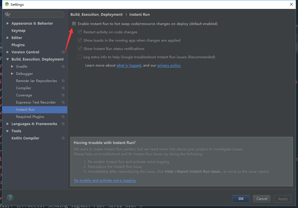 Settings>Build Execution Deplayment>Instant Run把对勾点掉保存,然后Clean一下项目运行