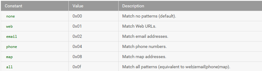 参数和上边列表对应,分别为:Linkify.WEB_URLS,Linkify.EMAIL_ADDRESSES,Linkify.PHONE_NUMBERS,Linkify.MAP_ADDRESSES,Linkify.ALL
