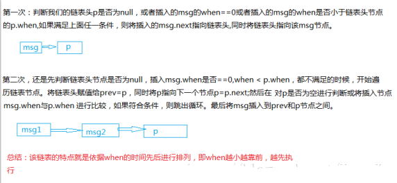 i. boolean EnqueueMessage():用于添加我们的Message,其整体流程是:首先判断Message对象的target是否为null(所附属的Handler,说白了就是发送源是否为null),如果为null,抛出异常“Message must have a target”。接着判断该Message是否正在使用,如果是,抛出异常“ This message is already in use.”。当上面条件不符合,则该Message是合法的,才开始添加到MessageQueue中。接着判断mQuitting是否为true,如果为true,抛出异常“sending message to a Handler on a dead thread”,说明依附的Hanlder所在的线程已死。所有的检查都不符合,则开始进行添加,首先通过markInUse()方法设置Message的flags |= FLAG_IN_USE;接着设置when参数,最后插入到链表中。下面我们就开始分析这个Message的插入流程顺序: