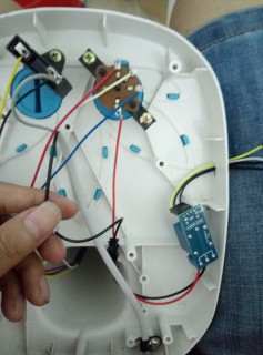 拆掉底座后,图是这样的,左边是定时的,坏了定不了。右边是调速的。把调速的电源线断开,接到继电器得被控端。使用继电器的常闭触点,就是把树莓派拿掉,风扇和原来一样用。
