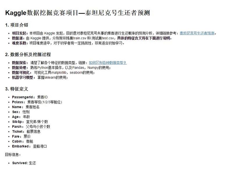 Kaggle作为公认的数据挖掘竞赛平台,有很多公开的优秀项目,而其中作为初学者入门的一个好的项目就是:泰坦尼克号生还者预测。