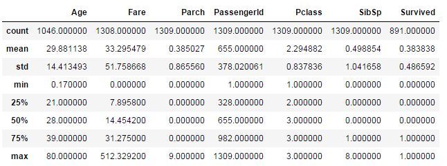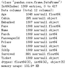 df.info() print('合并后一共{0}条数据。'.format(str(df.shape[0]))) print(pd.isnull(df).sum())合并后一共1309条数据,并可以看到:age,cabin,embarked,Fare 四个特征有缺失值,其中cabin缺失比较严重。