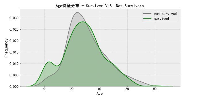 # kde分布 f,ax = plt.subplots(figsize=(10,5)) sns.kdeplot(data_train.loc[(data_train['Survived'] == 0),'Age'] , color='gray',shade=True,label='not survived') sns.kdeplot(data_train.loc[(data_train['Survived'] == 1),'Age'] , color='g',shade=True, label='survived') plt.title('Age特征分布 - Surviver V.S. Not Survivors', fontsize = 15) plt.xlabel("Age", fontsize = 15) plt.ylabel('Frequency', fontsize = 15)结论: