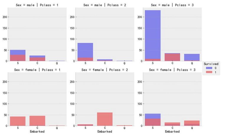 # 在不同社会等级下,男性和女性在不同登陆港口下的数量对比 grid = sns.FacetGrid(data_train, row='Sex', col='Pclass', hue='Survived', palette='seismic', size=4) grid.map(sns.countplot, 'Embarked', alpha=0.8) grid.add_legend()