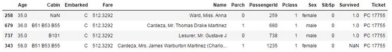 观察到Pclass1相对于2和3的Fare比较高,因为地位高,财富多。但是Pclass1中有几个大于500的异常值存在,看一下这些异常数据。