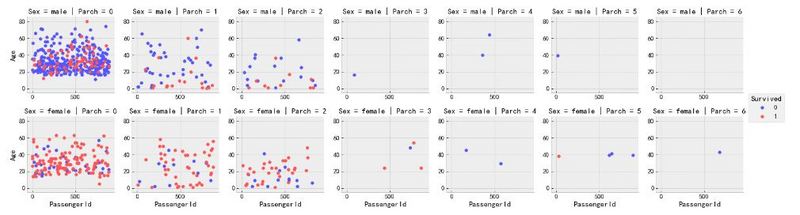 # Sex,Parch分类条件下的 Age年龄对Survived的散点图 grid = sns.FacetGrid(data_train, col = "Parch", row = "Sex", hue = "Survived", palette = 'seismic') grid = grid.map(plt.scatter, "PassengerId", "Age") grid.add_legend() grid