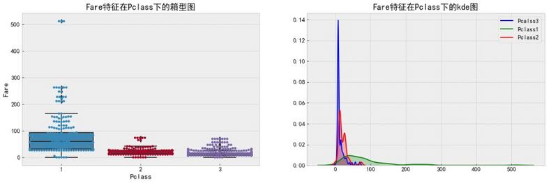 # 箱型图特征分析 fig, [ax1,ax2] = plt.subplots(1,2,figsize=(20,6)) sns.boxplot(x="Pclass", y="Fare", data=data_train, ax =ax1) sns.swarmplot(x="Pclass", y="Fare", data=data_train, ax =ax1) sns.kdeplot(data_train.loc[(data_train['Pclass'] == 3),'Fare'] , color='b',shade=True, label='Pcalss3',ax=ax2) sns.kdeplot(data_train.loc[(data_train['Pclass'] == 1),'Fare'] , color='g',shade=True, label='Pclass1',ax=ax2) sns.kdeplot(data_train.loc[(data_train['Pclass'] == 2),'Fare'] , color='r',shade=True, label='Pclass2',ax=ax2) ax1.set_title('Fare特征在Pclass下的箱型图', fontsize = 18) ax2.set_title("Fare特征在Pclass下的kde图", fontsize = 18) fig.show()结论: