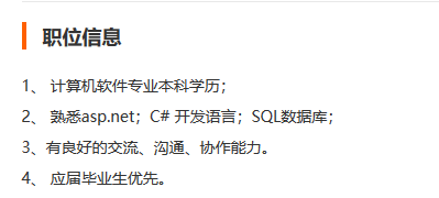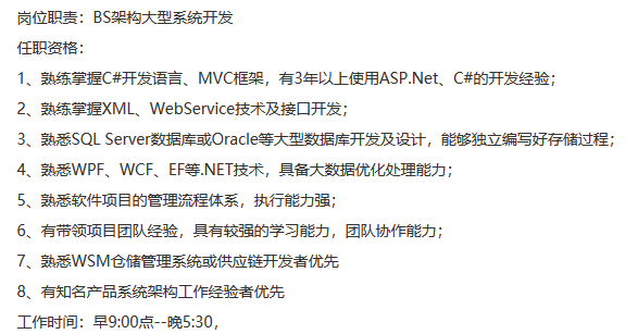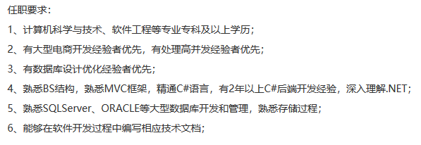 好了,我们看到了一些更多的东西,比如“大型”“高并发”“优化”,不过这些是优先项,会最好,不会也不强求。但对“B/S结构”“MVC框架”这类更基础一点的东西有要求了,C#语言要“精通”,并且要“深入理解”.NET。另外值得注意的一点就是:“技术文档”。所有的开发人员都讨厌写文档,但你要知道,能让你写文档,已经是对你能力的一种肯定了。技术没到一定水平,你写文档的资格都没有!